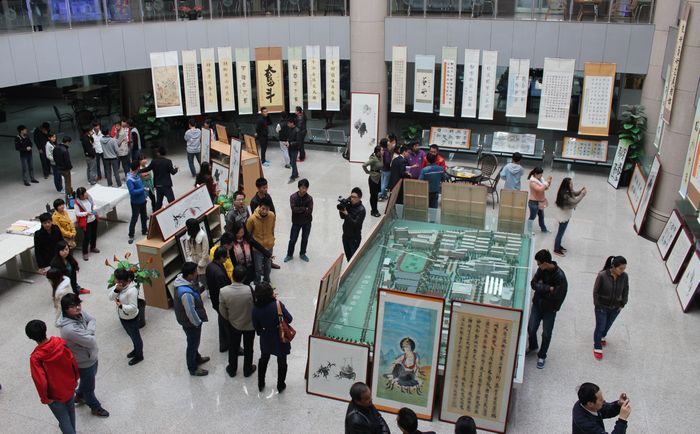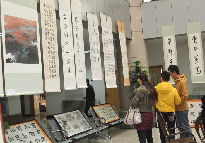 图书馆一楼大厅,由学生处艺术教育中心主办、大学生艺术团书画社承办的“迎新年树新风”大学生艺术团书画社帅凯强同学师友书画作品展吸引了众多前来观看的同学。