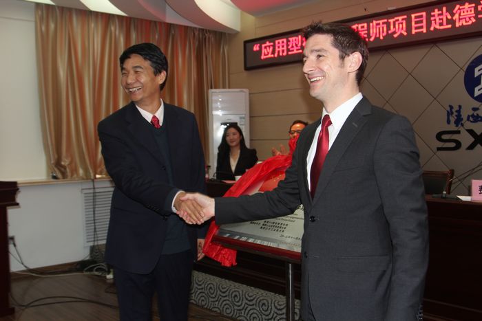费康安博士讲话。他说,中德教育的合作是强势之间的合作,对于双方分享、互补教育资源意义重大,希望更多的陕西工院学生能够通过合作项目走向德国、走向欧洲、走向世界,实现自己的职业梦想。