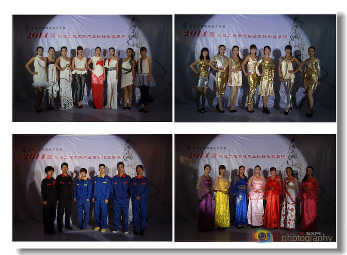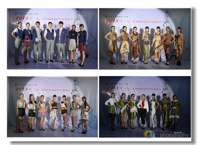 2014届毕业生设计的32个系列的作品涵盖职业装、工装、休闲装、礼服等多个门类,由服装学院业余模特队的28名同学进行静态展示,设计者陈述设计思路及制作工艺,评委们根据设计理念、款式造型、色彩搭配、制作工艺等进行现场打分评审。服制1101班严红娟、安晓珠同学的《白领职业装》,服装1103班张帅、杨红梅同学的《水墨丹青》,服装1103班杨婷、豆苗同学的《溪山兰若》,服装1102班庞一帆、梁娟的同学《族·韵》,服装1102班梅月姣同学的《secret》5件作品获得一等奖;服制1101班张朵、谢琦同学的《释放青春》等8件作品获得二等奖;服装1101班李洁、李蕊敏同学的《悠羽蓝韵》等12件作品获得三等奖。