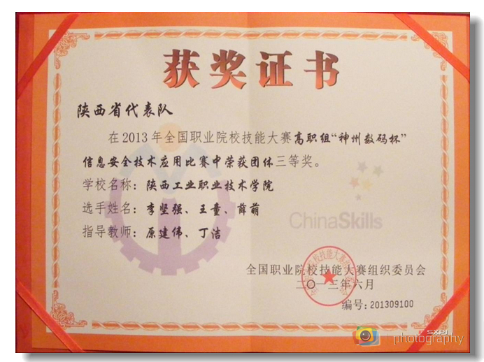 6月27日,2013年全国职业院校技能大赛“信息安全技术应用”赛项在天津市落下帷幕,该赛项汇聚了来自全国26个省市自治区66所高职院校的网路高手。经过在天津电子信息职业技术学院6个小时的比赛,我院信息工程学院学生李坚强(计控1001班)、薛萌(软件1102班)、王童(计应1102班)代表陕西省一队荣获团体三等奖。