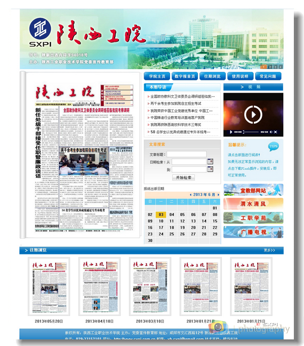该网站采用目前国内最先进的数字报技术,发刊时间与纸质报纸一致,每月15日更新。通过一段时间的运行完善,将可以查询出版的全部43期报纸。网站整体风格清爽明快,功能实用,并提供了文章检索、留言打分等功能,读者可根据自己的喜好缩放字体,发表自己的体会和看法。《陕西工院》数字报的上线,是我院校园媒体“报网合一”的又一突破,也为师生及时了解学院要闻、最新资讯提供了便捷的平台。