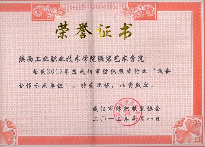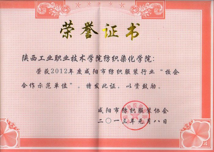 1月16日,咸阳市召开纺织服装协会理事会暨纺织服装工作年会。大会对2012年度咸阳市纺织服装行业先进单位进行了表彰,我院服装艺术学院(现更名为服装工程学院)、纺织染化学院(现更名为化工与纺织学院)被咸阳市纺织服装协会评为“校企合作示范单位”。
