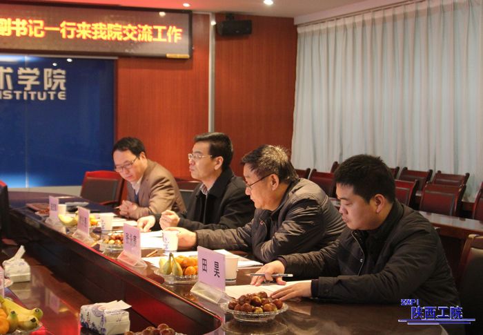 11月28日,陕西国防工业职业技术学院副书记刘少阳、党政办主任王建设、组织人事处负责人等一行4人就学院章程制定等工作来我院交流调研,我院党委副书记、纪委书记刘永亮、组织部部长张永庚、党政办主任朱忠军、党政办副主任田昊热情接待了来宾。