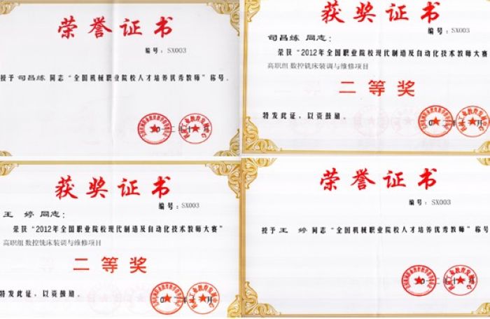 11月8日至11日,2012年全国职业院校现代制造及自动化技术教师大赛在浙江机电职业技术学院举行,我院数控工程学院教师司昌练、王婷在“数控铣床装调与维修”团体项目比赛中荣获二等奖,并获得“全国机械职业院校人才培养优秀教师”称号。