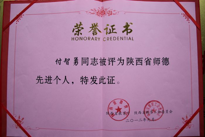 为迎接第28个教师节,大力弘扬“学高为师、身正为范”的高尚品德和无私奉献精神,促进教育战线师德建设工作的深入展开,经各高等学校推荐,省师德先进评选工作领导小组办公室组织专家评审和公示,省教育厅、省教育工会授予我院基础部“陕西省师德建设先进集体”荣誉称号,授予工商管理学院付智勇老师“陕西省师德先进个人”荣誉称号。
