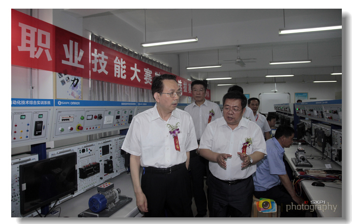 开幕式结束后,全体选手随即走进考场,进行紧张的实操考试。与会领导现场观摩了比赛并实地参观了我院发那科、欧姆龙实训中心等。