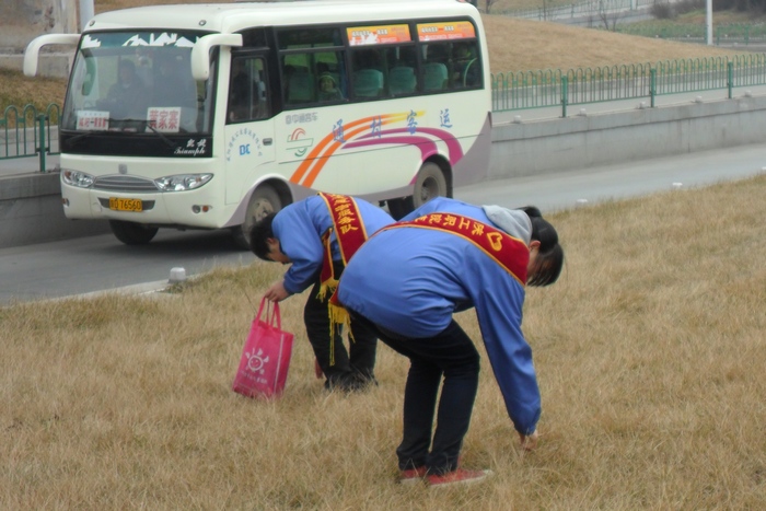 志愿者捡拾白色垃圾维护绿地