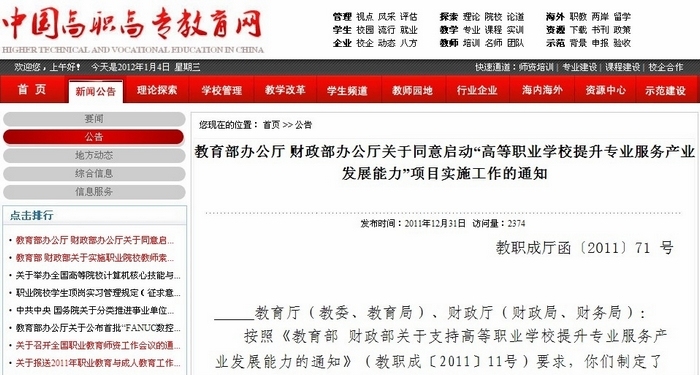 关于启动“高等职业学校提升专业服务产业发展能力”项目实施工作的通知