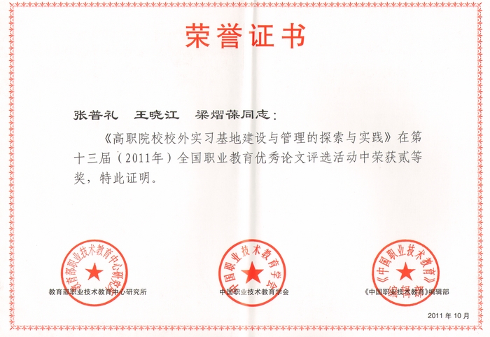 近日,在中国职业技术教育学会、教育部职业技术教育中心研究所和《中国职业技术教育》编辑部组织的第十三届(2011)全国职业教育优秀论文评选活动中,我院共有8篇教育教学类论文获奖,其中邓志辉、杨卫军撰写的《高职院校怎样在培训员工方面推动校企合作》,张普礼、王晓江、梁熠葆撰写的《高职院校校外实习基地建设与管理的探索与实践》获优秀论文二等奖;陈玉祥撰写的《体育教学中的多媒体技术运用》、付胜利撰写的《基于职业教育的美育课程改革研究与实践》获优秀论文三等奖;王晓梅等撰写的其他四篇论文获优秀奖;同时,学院还获得了优秀组织奖。
