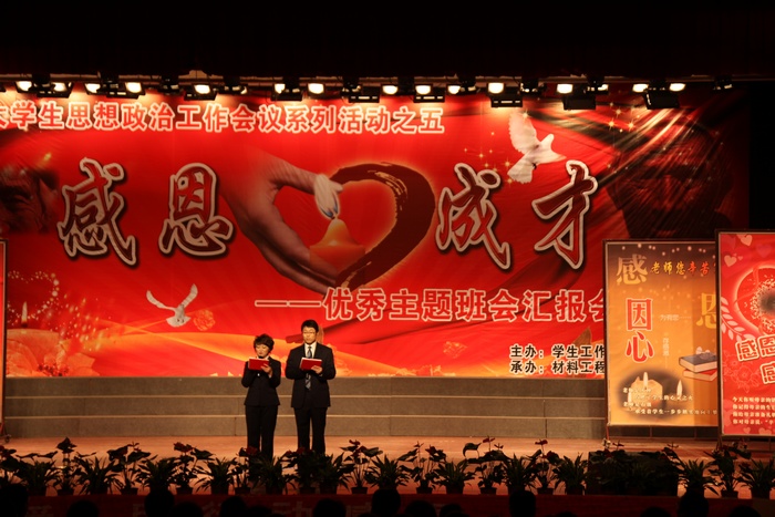 12月6日下午,学工部主办,材料工程学院党总支承办的“大学生思想政治工作系列活动之五 ——《感恩·成才》优秀主题班会汇报会”在明德大礼堂隆重举行。党委副书记王天哲和学工部、宣传部、思政部负责人,各二级学院党总支书记、学工办主任、辅导员、班主任及1000余名学生代表参加了汇报会。