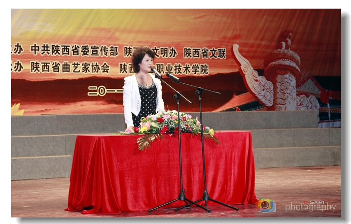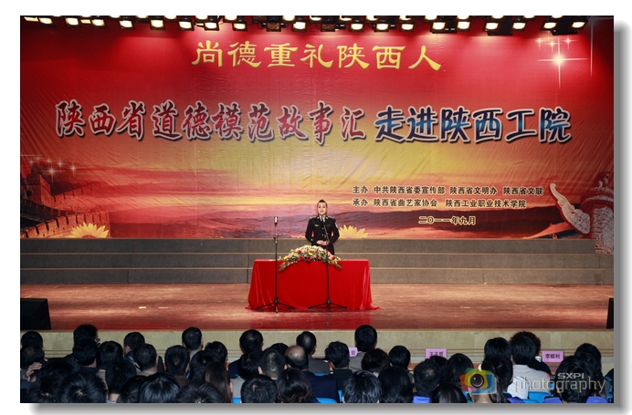 省曲艺家协会原副主席刘文龙、副秘书长李晓春和学院领导崔岩、李顺利、王天哲、赵嘉骏,中心组成员,各部门、二级学院负责人和师生员工约1200人一同观看演出。党委副书记王天哲在演出开始前致辞。他指出,我院历来重视精神文明建设工作,持续深入地开展群众性文明创建和道德建设活动,先后荣获“全国机械行业文明单位”、“全国学校艺术教育先进单位”和“陕西省平安校园”等称号。他希望通过本次活动,引领全院师生自觉以先进典型为榜样,从我做起、从现在做起、从身边小事做起,打造品牌专业、造就教学名师、培养高素质学生,为民族振兴培育新时期装备制造业和纺织服装业生产、建设、管理、服务一线需要的高素质技能型专门人才。