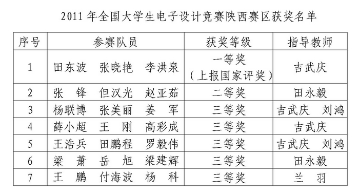 近日,从2011年全国大学生电子设计竞赛陕西赛区组委会传来喜讯,由教务处领导,电气工程学院组织的12支参赛队共获得七个奖项,其中陕西省一等奖1项,被推荐参加全国评奖;二等奖1项;三等奖5项。同时,学院再次被授予“优秀组织奖”。