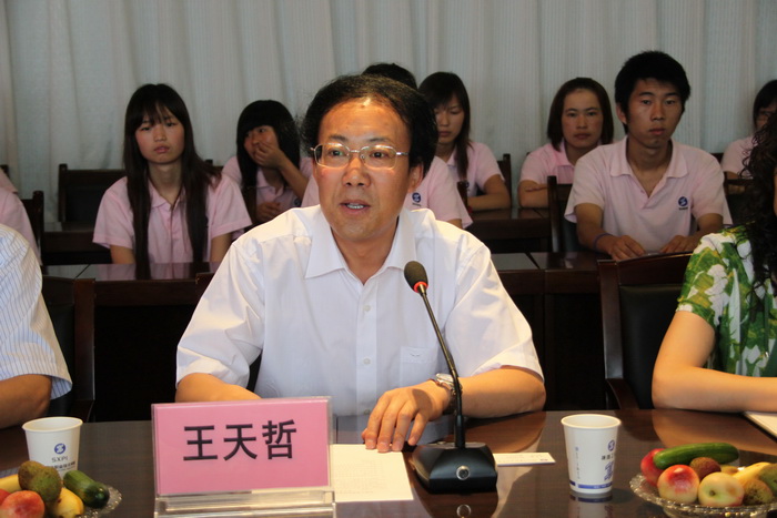 王天哲副书记致欢迎辞,他对常熟市东方染整厂在我院设立奖学金表示感谢,并介绍了我院的发展历史、人才培养、专业建设等。
