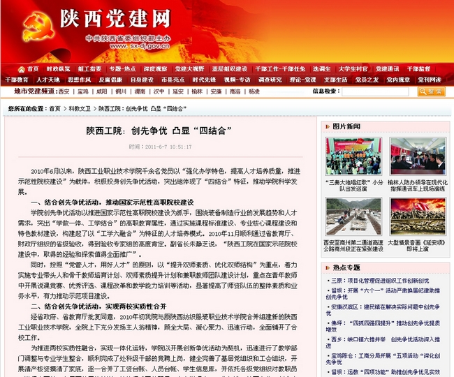 近日,陕西党建网以《陕西工院:创先争优 凸显“四结合”》为题,解读我院结合示范院校建设、两校合并工作、学习型组织建设和管理效能提升年活动开展创先争优活动,取得实效的经验和做法。全文转载如下: