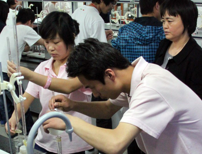 纺织染化学院举办的首届化学检验工技能决赛于5月14日在笃学楼化学实训室举行。61名决赛选手沉着应战、认真分析、仔细观察,现场利用指定的实验仪器及药品确定最合理的实验方案,测取有关数据,并将实验结果整理成完整的书面报告。经过3个半小时的紧张比拼,最终18同学获奖,其中一等奖3名、二等奖6名、三等奖9名。