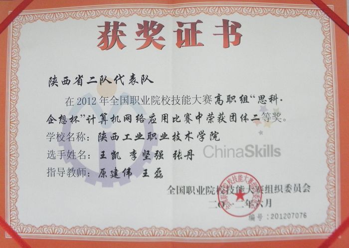 全国52个代表队156名队员参加了计算机网络应用赛项,经过6个小时的激烈拼搏,我院信息工程学院学生组成的陕西一队、二队双双荣获团体二等奖,实现了我省在该赛项零的突破。