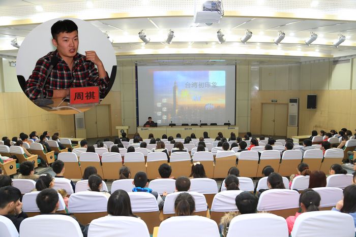 周祺同学从当选交流生所具备的条件、交换学校的概况及学习、生活情况等方面进行了汇报。他详细讲解了申请交流生的流程、入台条件、台湾初印象、学校介绍、学习情况、学习心得以及个人建议。同时分享了台湾学校课程少、学习节奏慢,自学氛围浓、课堂气氛活跃,课余生活丰富多彩,校外活动轻松有趣等特点。