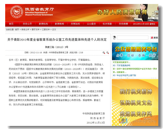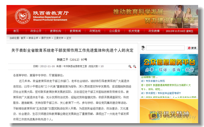 11月16日,根据中共陕西省委教育工委、省教育厅《关于表彰2012年度全省教育系统办公室工作先进集体和先进个人的决定》(陕教工秘〔2012〕3号文件)精神,我院党政办公室与全省48个地市和兄弟院校党政办公室被授予“全...