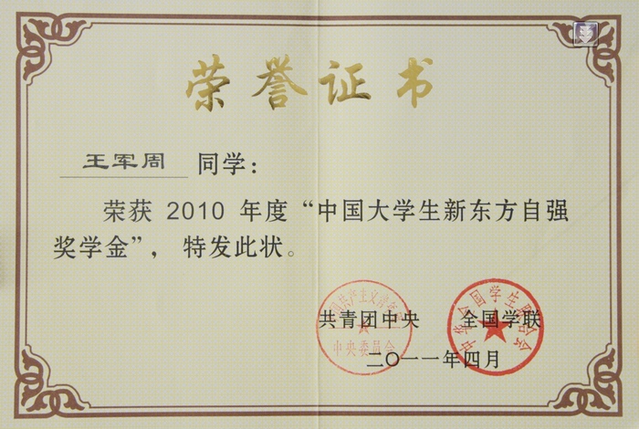 日前,由共青团中央、全国学联主办,中国青年报社和中国高校传媒联盟承办,新东方科技教育集团协办的2010年度 “中国大学生自强之星”、“中国大学生新东方自强奖学金”活动评选结果揭晓,我院信息工程学院王军周荣获...